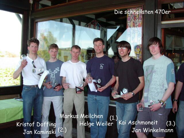 Ergebnisse der 470er: 1. Markus Meilchen/Helge Weiler (Baden-Württemberg) 2. Kristof Duffing/Jan Kaminski (NRW/Hessen) 3. Kai Aschmoneit/Jan Winkelmann (Segelclub Inheiden, Hessen)